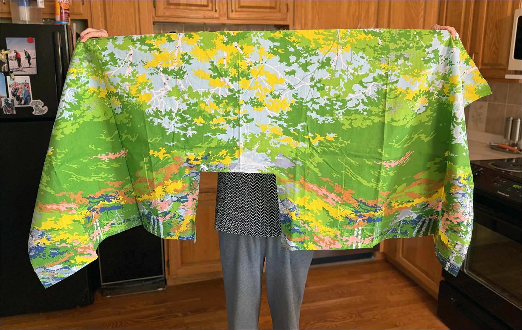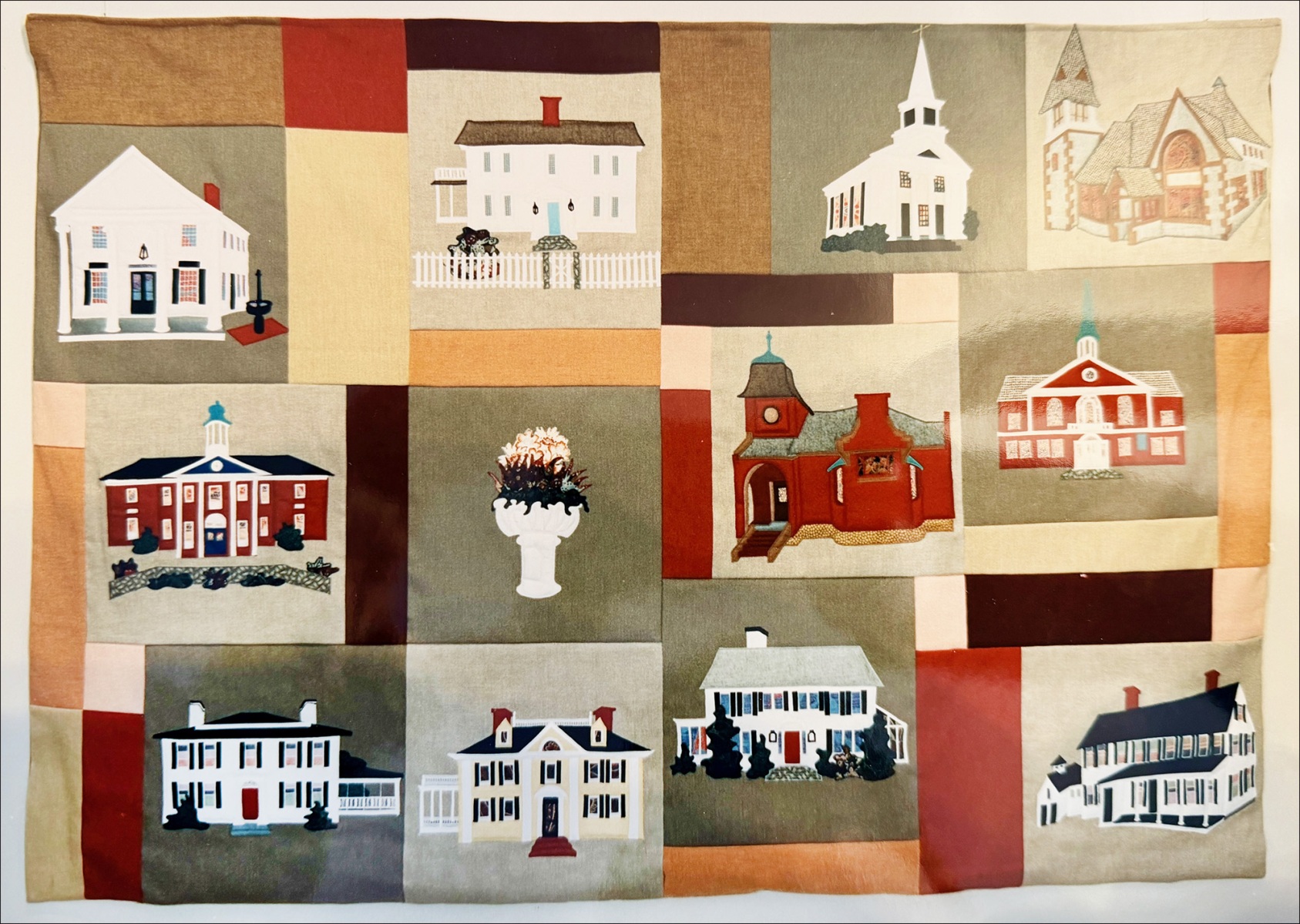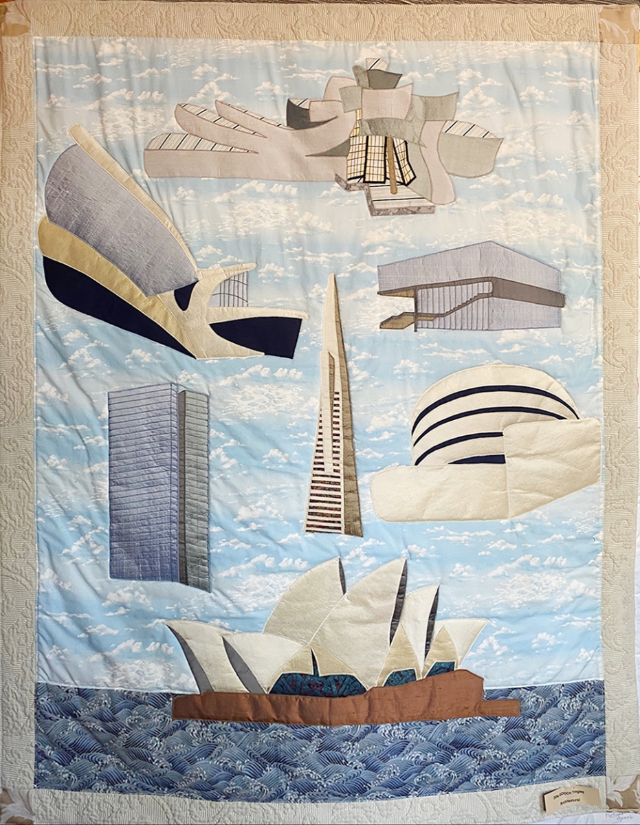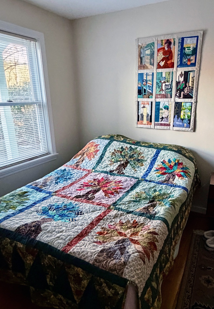 In 1988, she took early retirement from Polaroid, “and I bought a sewing machine on my way home from my last day of work,” she says. She started by making pillows and eventually graduated to quilts. Her process involves finding interesting fabrics, then sketching a design, cutting out appliques, and ironing them onto pieces of fabric to guide her in cutting. When choosing a subject or theme, she’s guided foremost by practicality. “Generally when I see the image, my first thought is: how easy would that be to render?” she says.