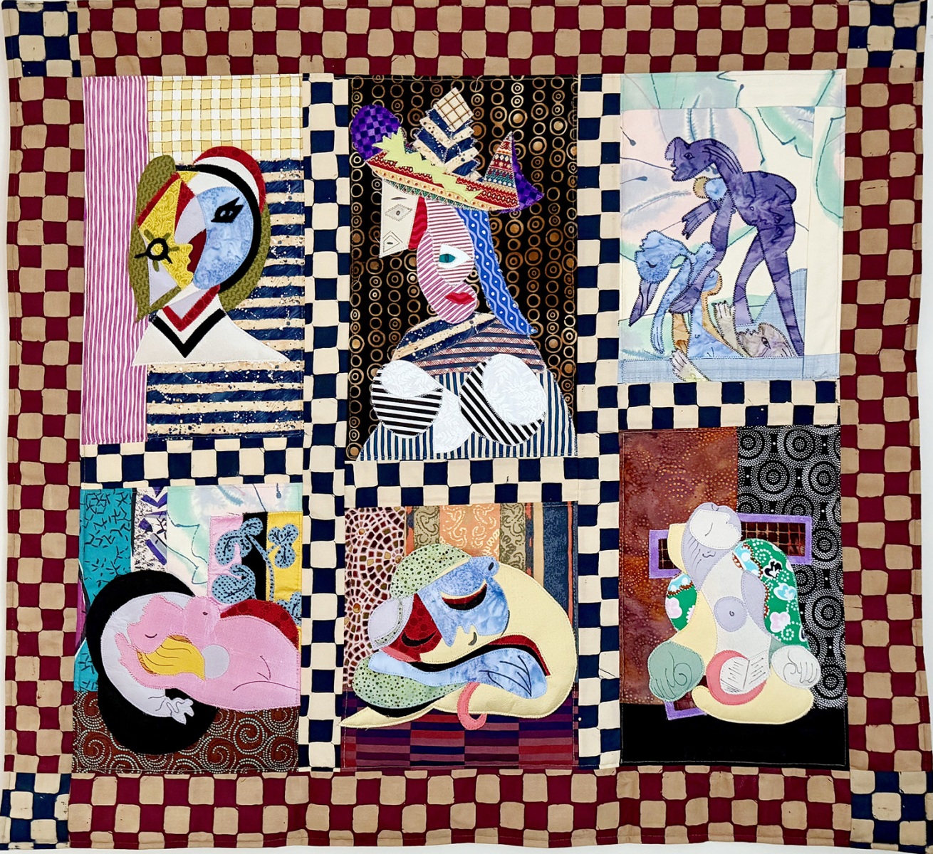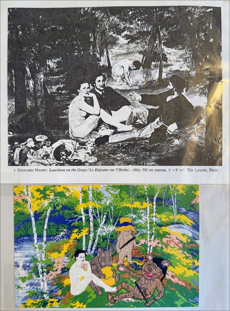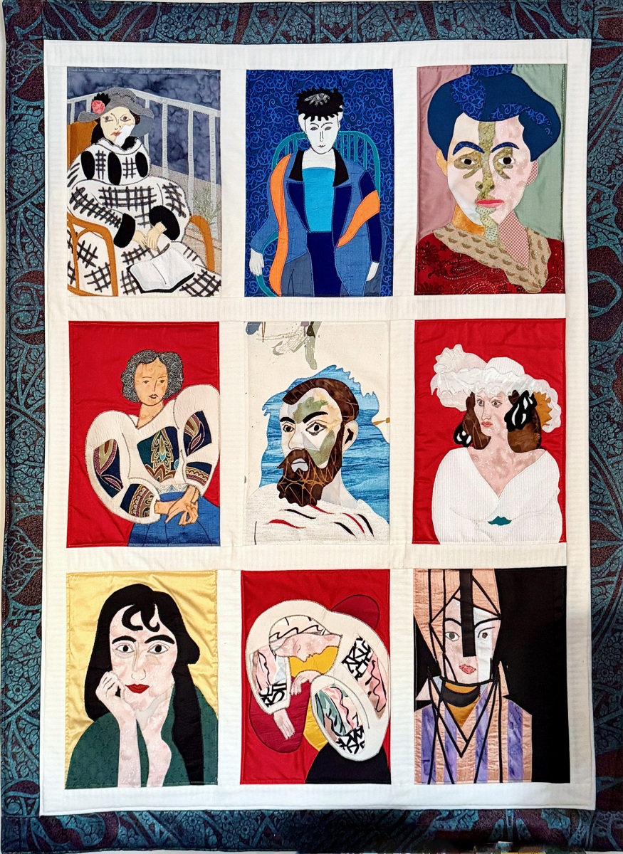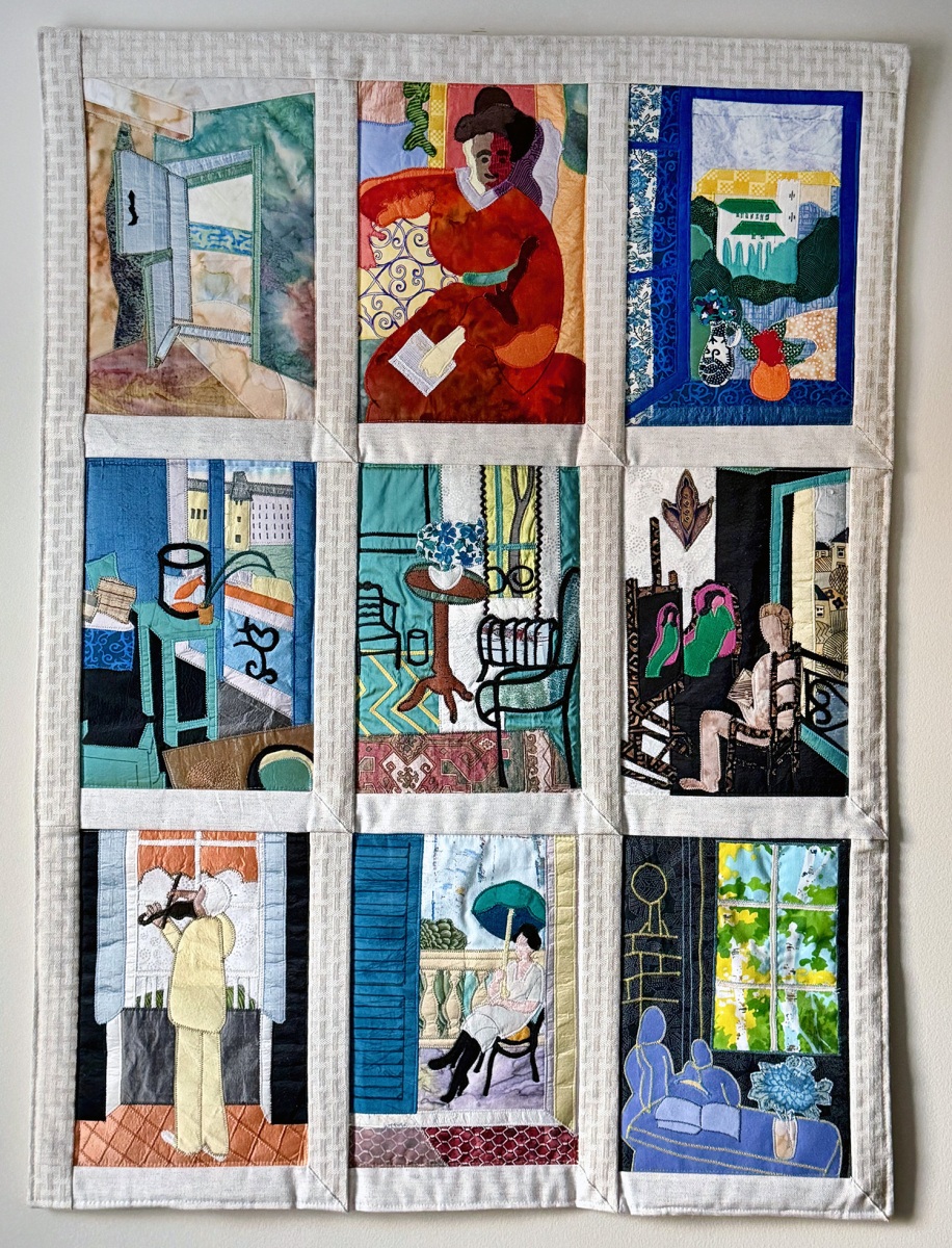 Then there’s “Windows on Matisse,” a 3×3 arrangement of Matisse paintings with windows, and a collage of works by Picasso. She’s also made quilts based on Inuit art, Escher, Van Gogh, Toulouse-Lautrec, and Gauguin, “but Monet is too hard,” she says. Often there’s a humorous twist, such as a piece based on “Luncheon on the Grass” by Edouard Manet — except the gathering of picnickers now includes Paddington Bear and Winnie the Pooh.