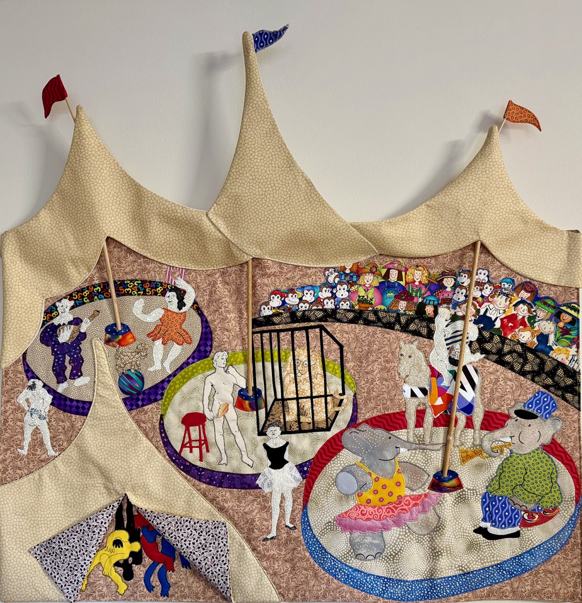 Tingley’s quilts aren’t always rectilinear, either. There’s “Damn Everything But the Circus,” whose top has the billowy shape and texture of a circus tent, and a round piece depicting a crying sun called “Sol Says Sorry” (caption: “My life-enabling warmth is causing so much grief — I cry for you”) that was included in the global warming exhibit.