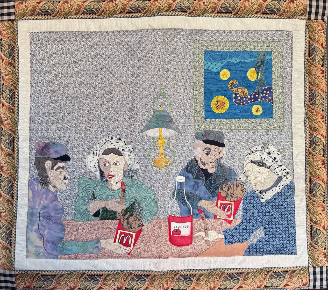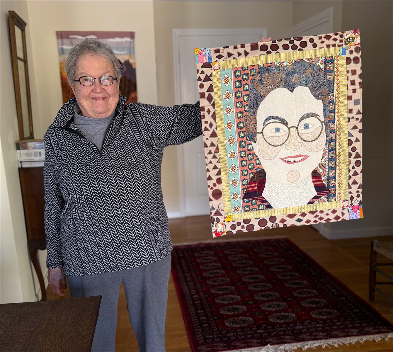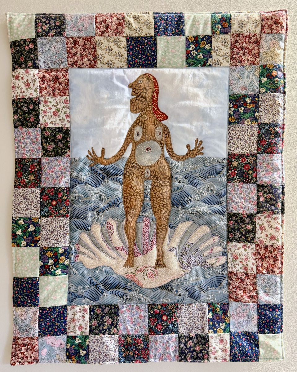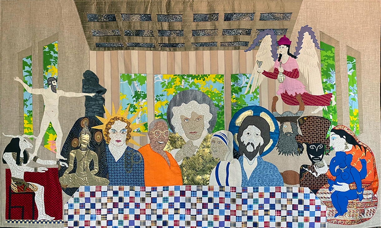 “I’m most delighted in my work when I can take an artistic subject and reinterpret it in an interesting way,” she says. Many of her quilts are based on famous paintings, such as “The Next Supper,” a takeoff on da Vinci’s “The Last Supper” where the dinner guests are religious figures including Buddha, Ganesh, Jesus, and Mother Theresa.