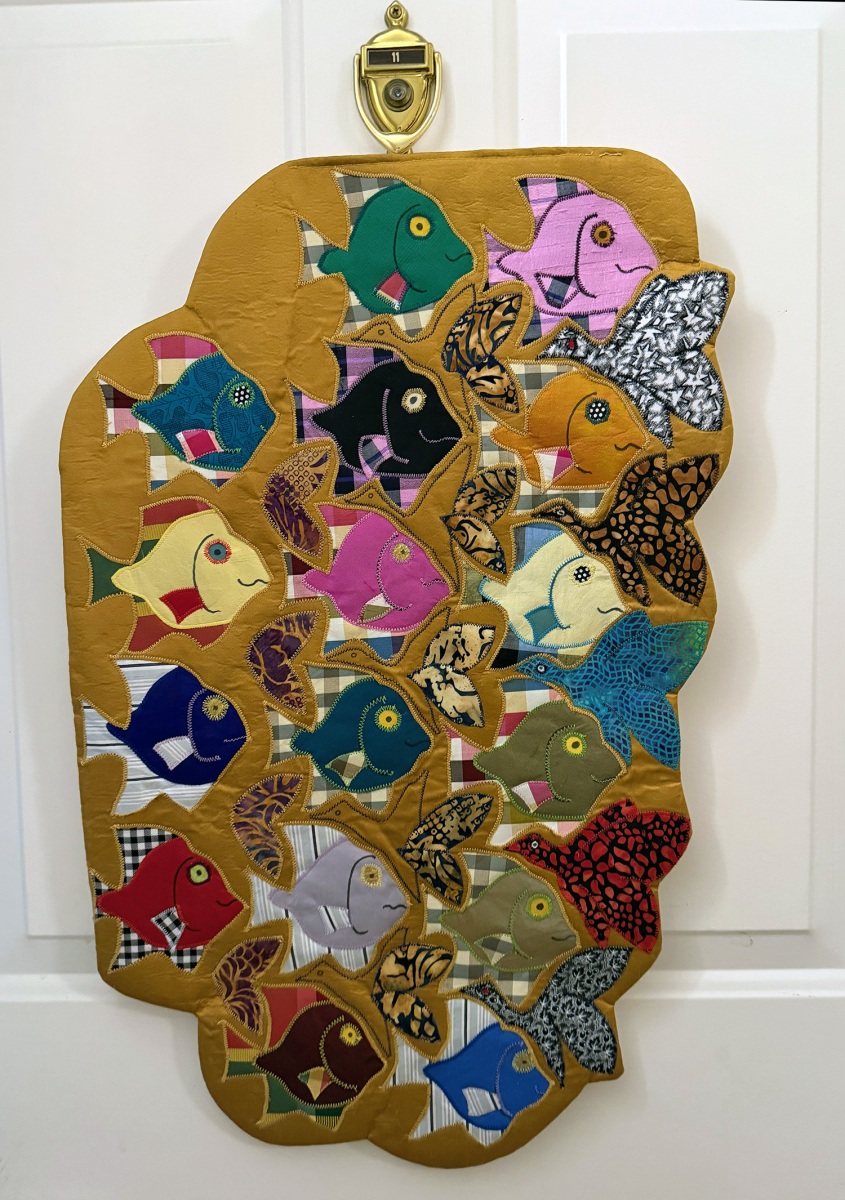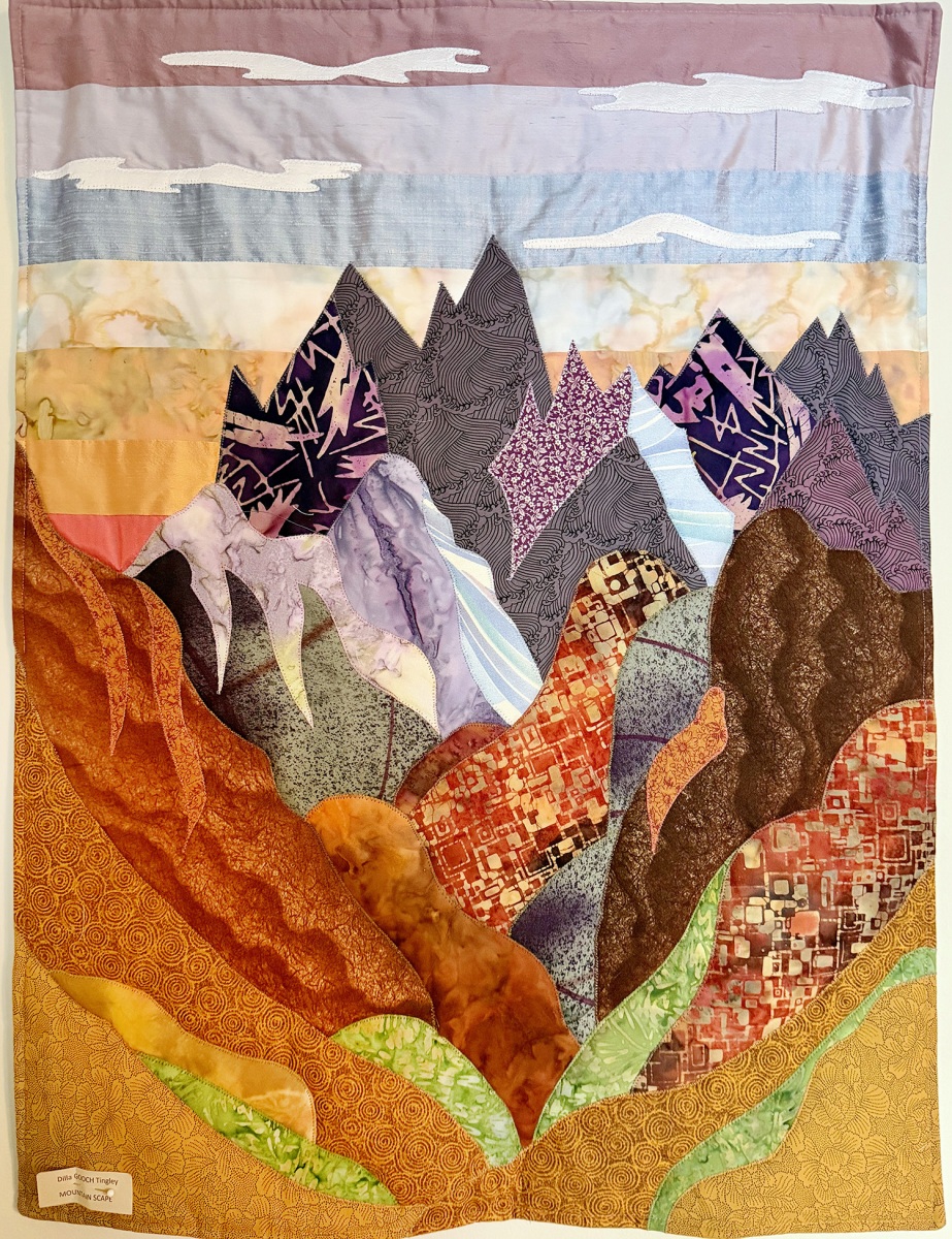 In her former Lincoln home on Laurel Drive, Tingley’s workshop took up most of the basement and featured dozens of cubbies for fabric and a hanging quilt rack that her late husband Fred made for her. She downsized to a Ryan Estate condo after his death in 2022 but still has room on her walls for many of her quilts along with a bedroom repurposed as a workroom. Not surprisingly, her collection of fabrics includes few of the familiar cotton scraps often seen in American quilts. For textures and background, she’s used everything from batik to silk to African mud cloth (“Demoiselles d’Mud Cloth” based on the similarly titled Picasso painting).