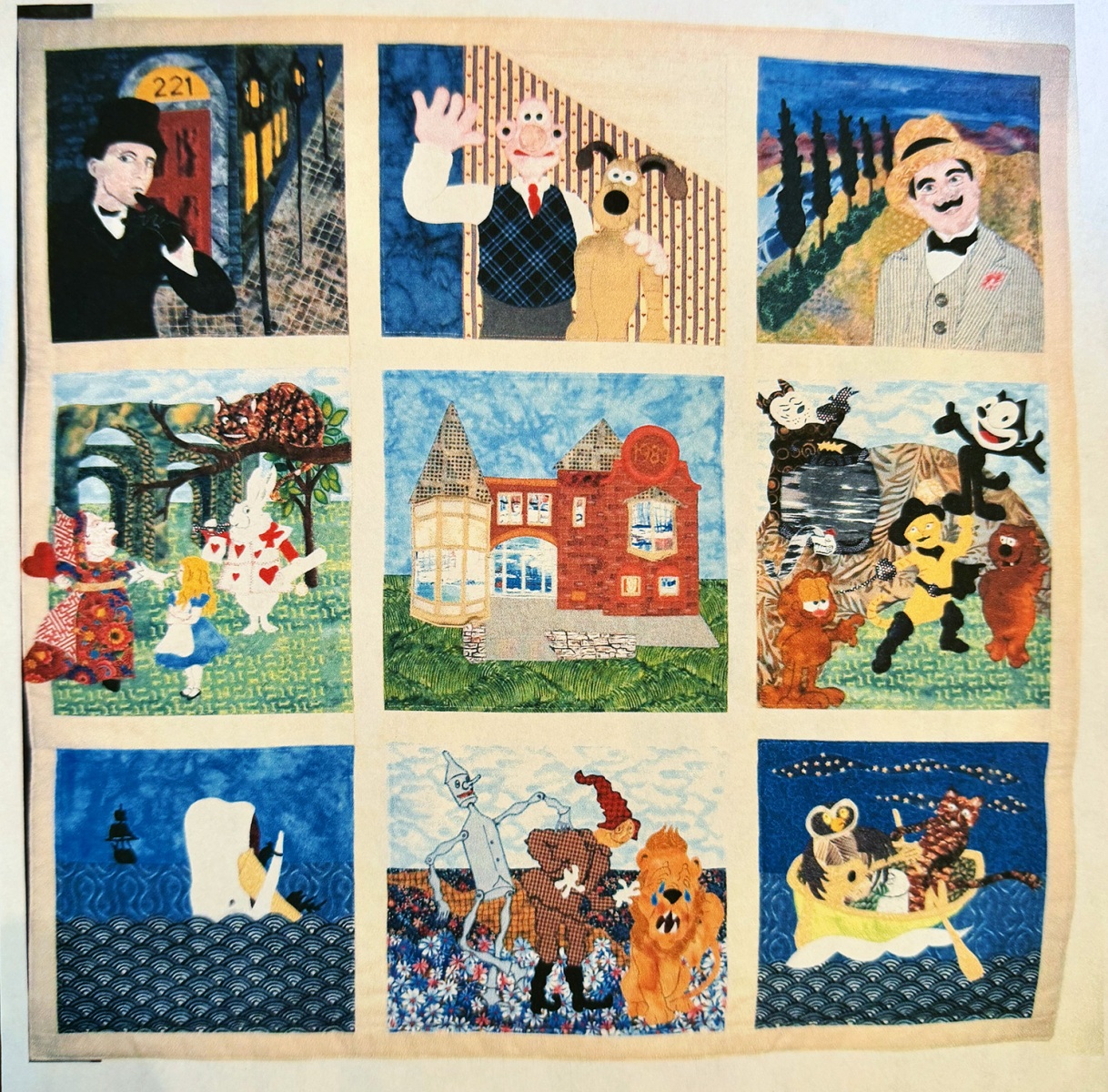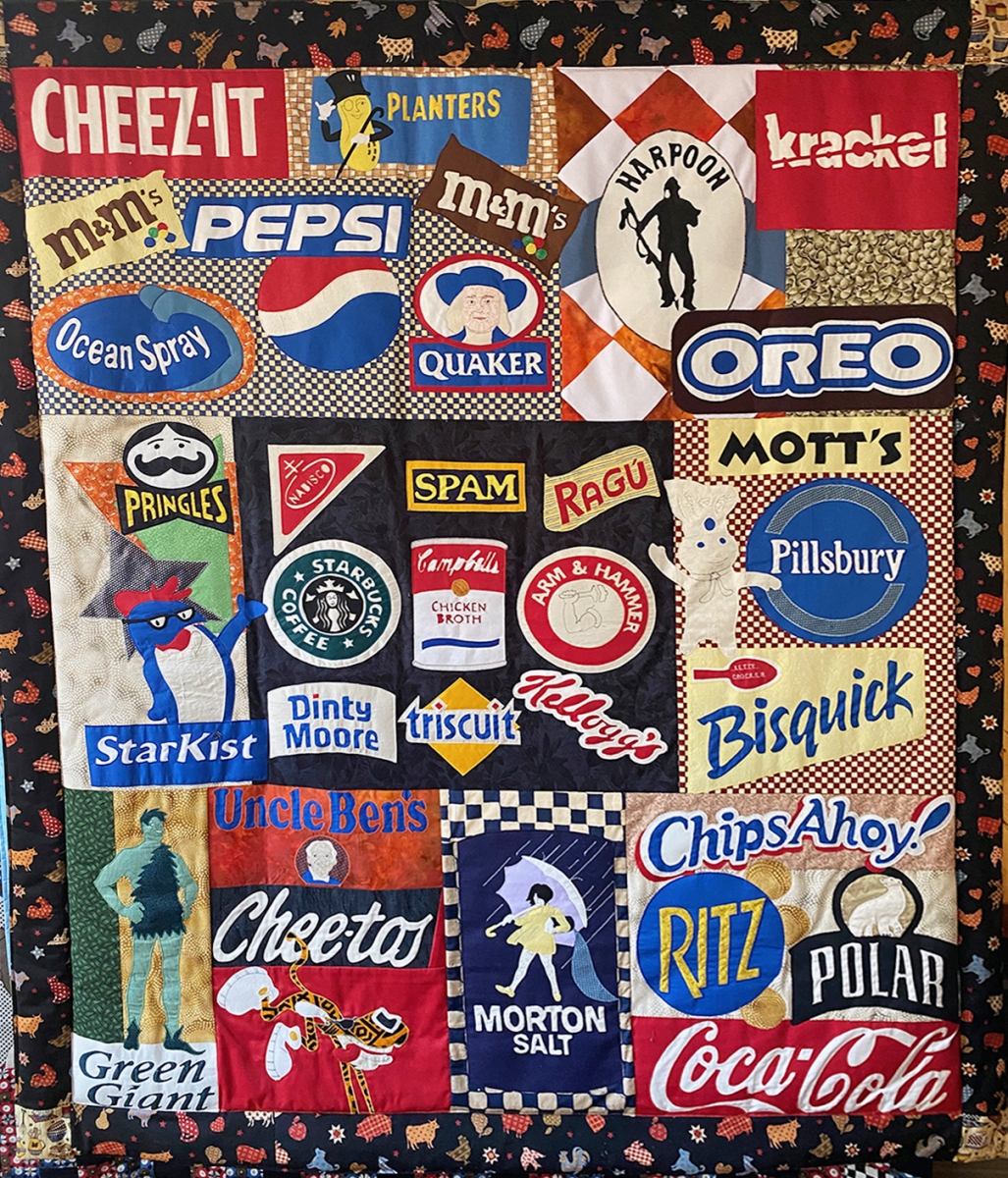 Some of Tingley’s quilts are based on art forms other than painting, such as “Architextural,” a collection of famous modern buildings including the Sydney Opera House, the Guggenheim Museum in Bilbao, and the Transamerica building in San Francisco. As a surprise gift to Ellen Sisco, Lincoln’s assistant librarian who retired in 2014, she made a quilt with some of Sisco’s favorite literary characters and books such as Sherlock Holmes, Hercule Poirot, “The Owl and the Pussycat,” “The Wizard of Oz,” and Wallace and Gromit. Another quilt called “Ex Libris” showing characters including Babar, Humpty Dumpty, and Madeline hangs in the children’s room at library. And decidedly non-literary is “Branded,” an array of brightly colored logos of Cheez-Its, Green Giant, Morton Salt, and more.