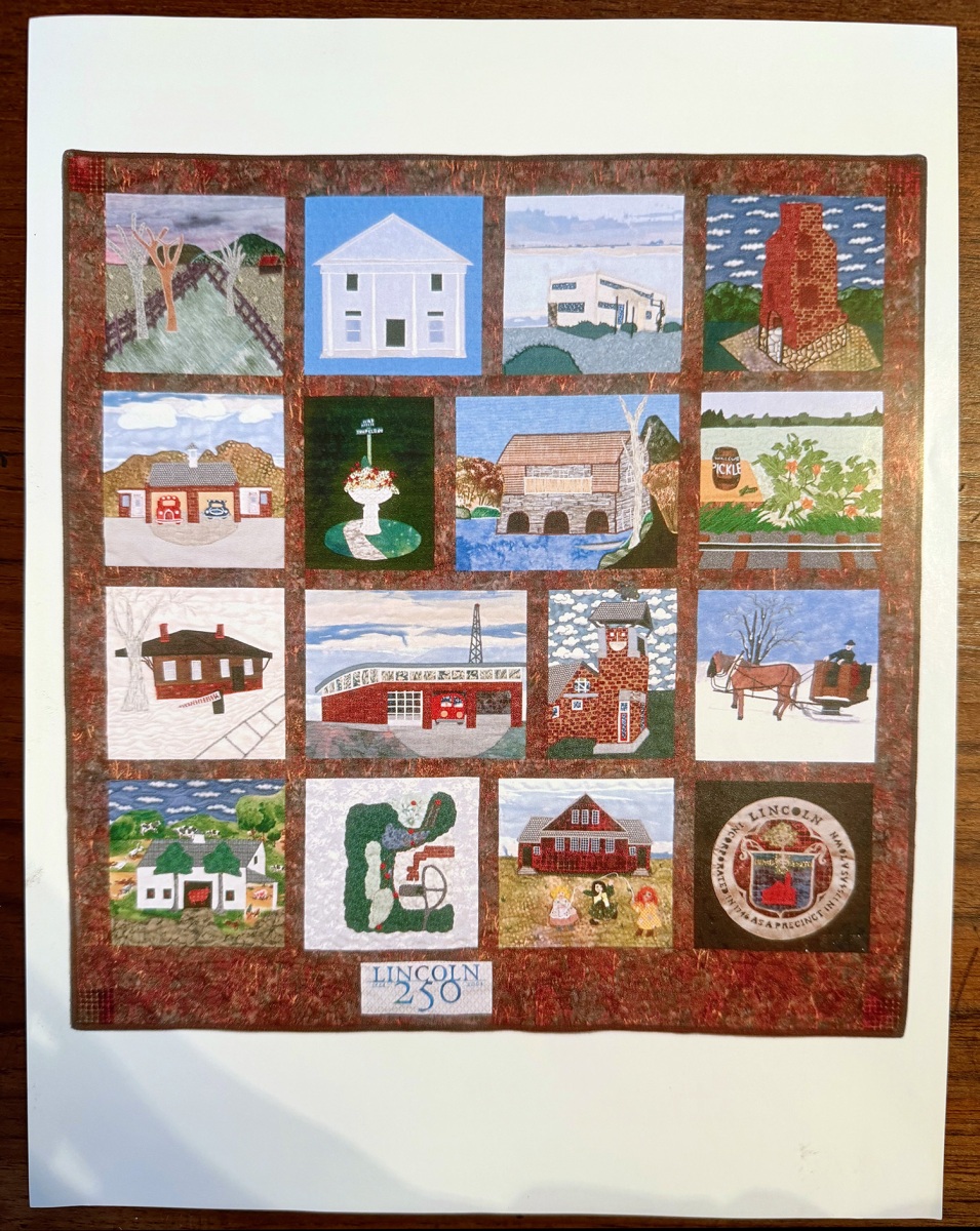 In 2004 she organized a group to make a quilt to celebrate Lincoln’s 250th anniversary. It features scenes from Lincoln’s history, including the Lewis Street pickle factory and a boathouse on Sandy Pond, and now hangs in the Tarbell Room at the library. Since about 2024, she’s been a member of the Lincoln Quilters., whose members work on quilts together. They recently exhibited in the Lincoln Public Library and held a silent auction of quilts that raised nearly $8,000 for charity.
