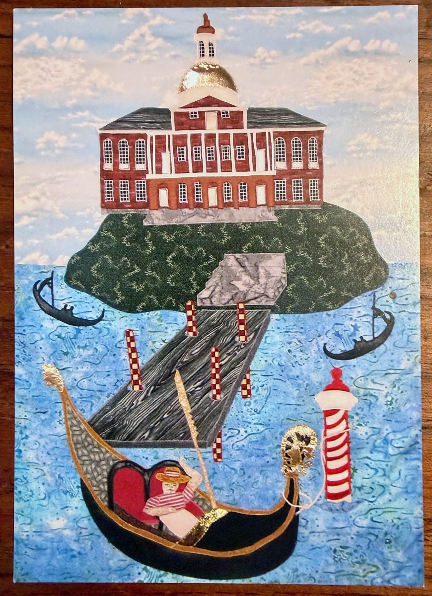 Tingley’s work has been featured in numerous solo and group exhibits at the Depot Square Gallery in Lexington, including a 2007 show called “HOT: Artists Respond to Global Warming.” Her submissions included the slyly humorous “We Love Our Cars” with colorful background landscapes overrun with cars full of monkeys, and “Venice of Massachusetts” showing a Venetian gondola in front of a State House at the top of Beacon Hill island surrounded by water.