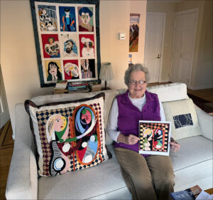 Dilla Gooch Tingley shows some of the pillow she’s made. On the wall behind her is a quilt titled “Portraiture a la Matisse.” Click image to enlarge.